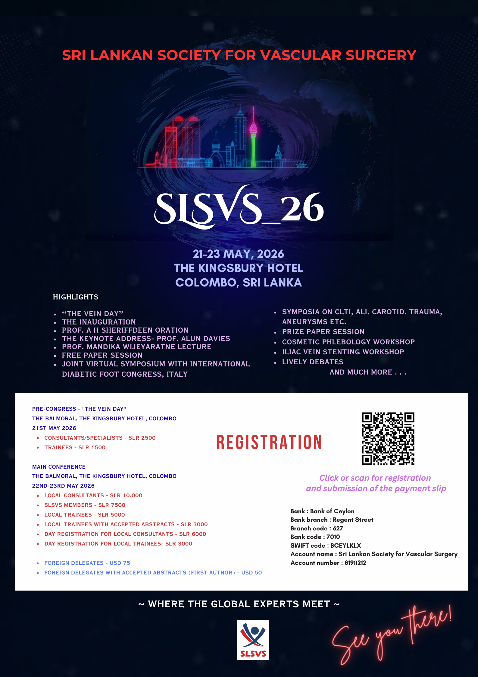We will gather in Colombo from the 21st to the 23rd of May 2026 for our Annual Congress SLSVS_26; the flagship event of our Society, SLSVS. This occasion has been outlined with a strong focus on academic excellence with your collaboration and support to enhance the knowledge and share the experience in vascular surgery.